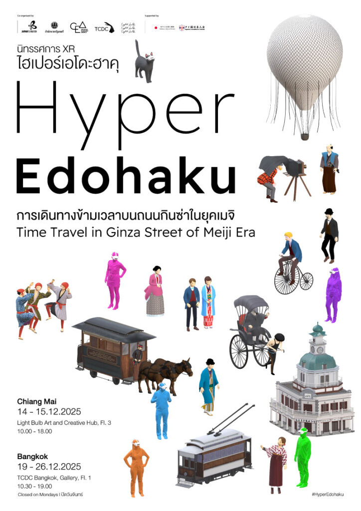 The Japan Foundation, Bangkok in collaboration with the Creative Economy Agency (CEA) and Light Bulb Art and Creative Hub are very pleased to co-organize the newest cutting-edge traveling exhibition “Time Travel in Ginza Street in Meiji Era – Hyper Edohaku” during 14-15 December 2025 at Light Bulb Art and Creative Hub in Chiang Mai and 19 – 26 December 2025 at TCDC Bangkok. Created and produced by the Tokyo Metropolitan Edo-Tokyo Museum, the XR* The contents of “Extreme Edohaku” will be the pivotal feature that enables visitors to experience the interactive exhibits by travelling back to Ginza Street during the Meiji period (1868-1912) in multiple languages optimized for each individual locality.