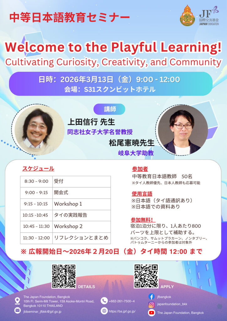 このたび、国際交流基金バンコク日本文化センターとタイ教育省基礎教育局は、「Welcome to the Playful Learning! Cultivating Curiosity, Creativity, and Community」をテーマに中等日本語教育セミナー開催することとなりました。