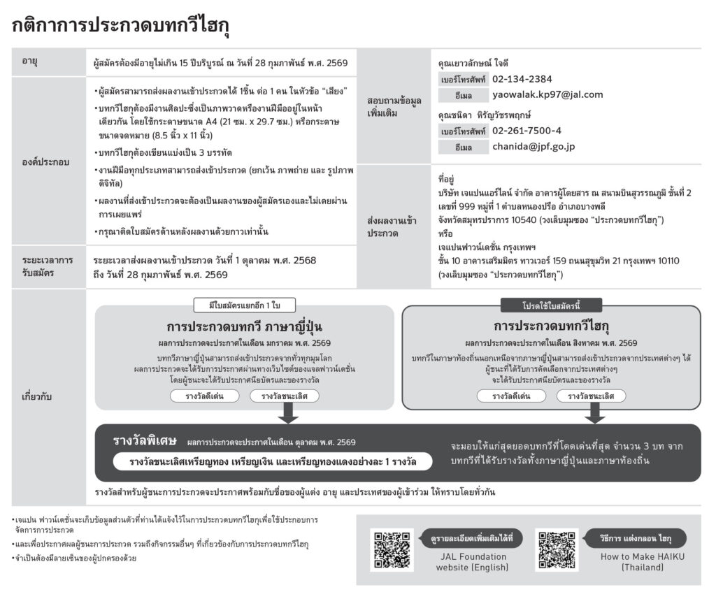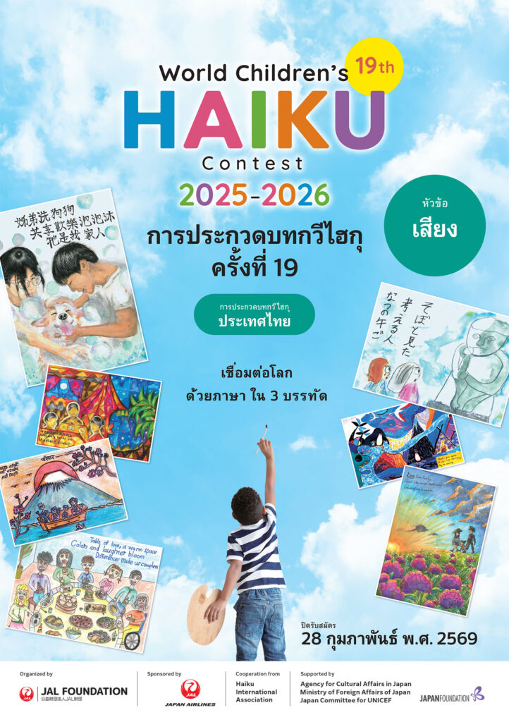 ขอเชิญนักเรียนระดับประถมศึกษาและมัธยมศึกษาตอนต้นที่มีอายุไม่เกิน 15 ปีบริบูร์ ณ วันที่ 28 กุมภาพันธ์ พ.ศ. 2569 ร่วมส่งผลงานบทกวีไฮกุพร้อมภาพวาดหรือประดิษฐ์งานศิลปะด้วยตนเอง